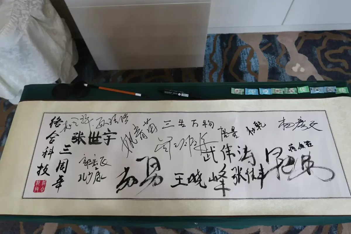 西柏坡之行结束后,全员驱车前往平山县野生园度假村,在酒店内预定的多功能会议室隆重举行公司庆典活动,活动入场时,让全员用手中的毛笔或者记号笔进行签到,书写各自的姓名并保存留念。